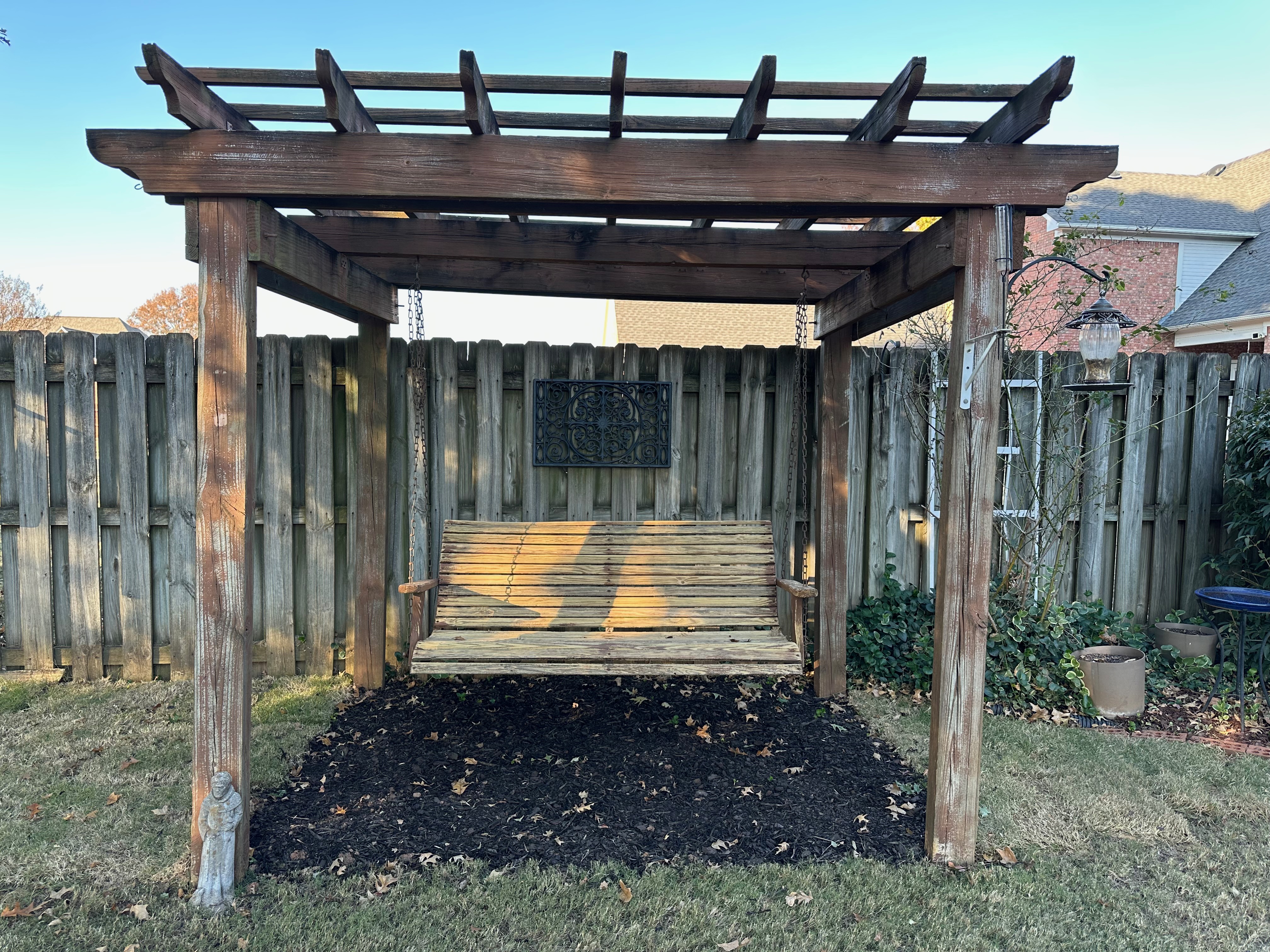 The lawn has been lavishly landscaped. A pergola, swing and play fort optimize outdoor living.
