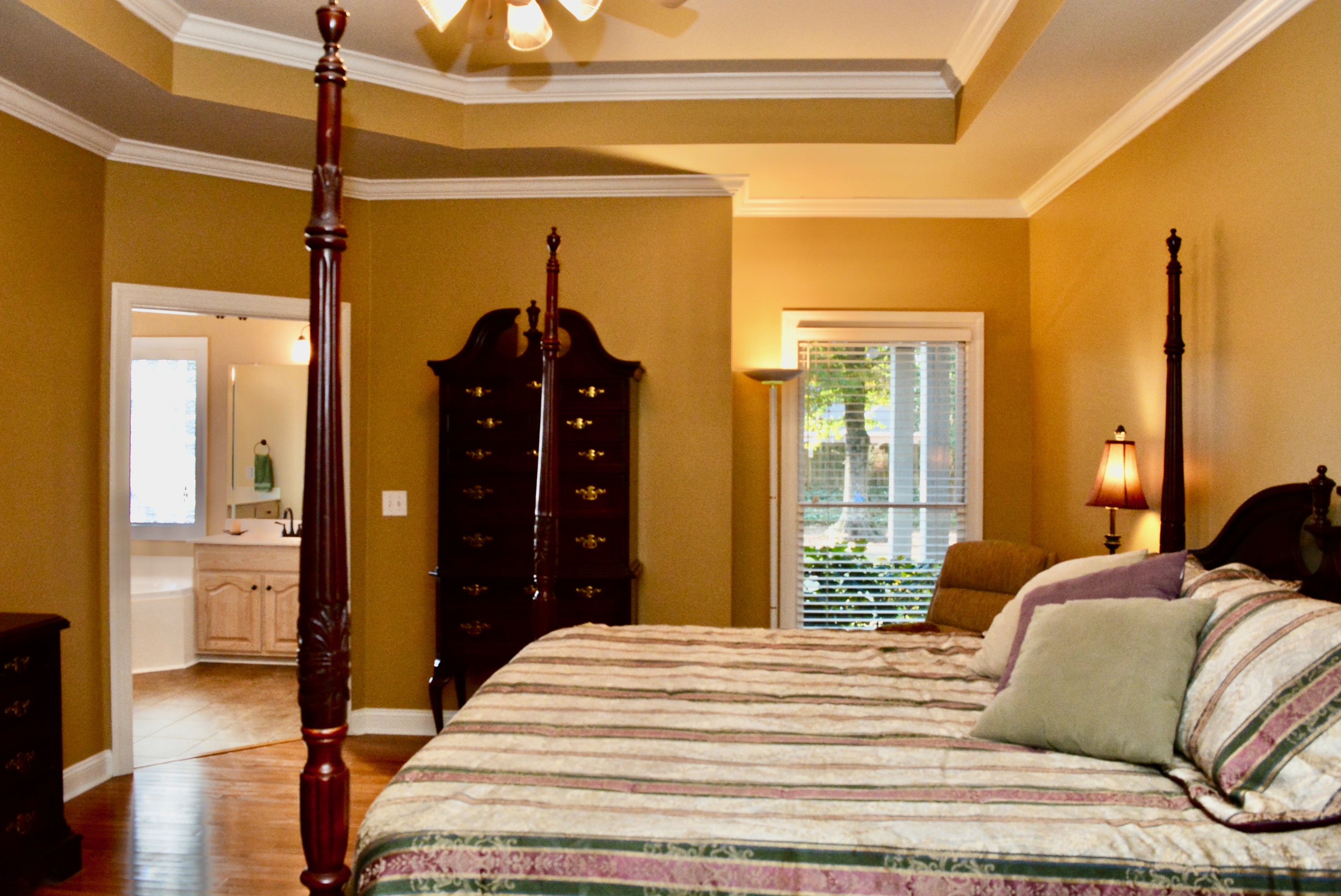 The isolated master suite includes a trey ceiling, two walk-in closets, and glamour bath with two vanities, corner jetted tub, and separate shower.
